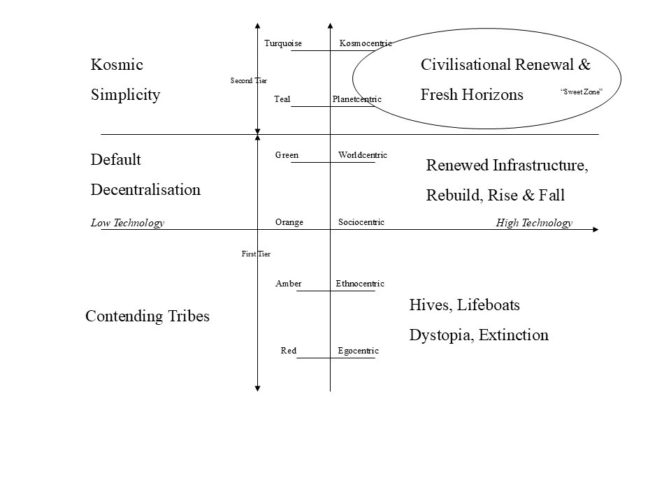 The upper reaches of values development then lead into territory that must be treated with care since few people have accessed these advanced levels directly or in a sustained way. Sufficient clues can be gleaned, however, to make some suggestions about how human and social prospects appear to shift into new territory here. That is, they appear to go through a kind of phase change—a shift from one state to another. What have been called “second tier values” are sufficiently broad and deep to recognise the validity and necessity of all other value sets. This gives them unprecedented freedom in that they can inhabit all other value sets without identifying with them, without, that is, seeing the world only from a particular stance. In a profound sense, therefore, people with second tier values are, in essence, peacemakers and protectors of the entire Earth community. They are also proven sources of wisdom and deep understanding. It is, however, the high-tech version of second tier that is the most interesting because it is here that I think we can glimpse the beginnings of thoroughgoing civilisational renewal and the emergence of truly “fresh horizons.”